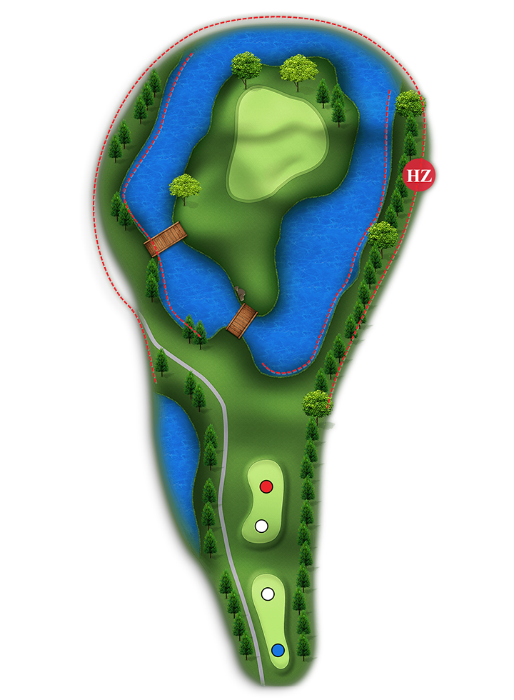 Par3홀입니다. 깃대가 그린 중앙이나 왼쪽에 있을 때는 깃대를 바로 공략하셔도 괜찮지만, 오른쪽에 깃대가 있다면 약간의 슬라이스로 벙커나 해저드 위험이 있으므로 깃대보다 약간 왼쪽으로 공략하는 것이 좋습니다.
