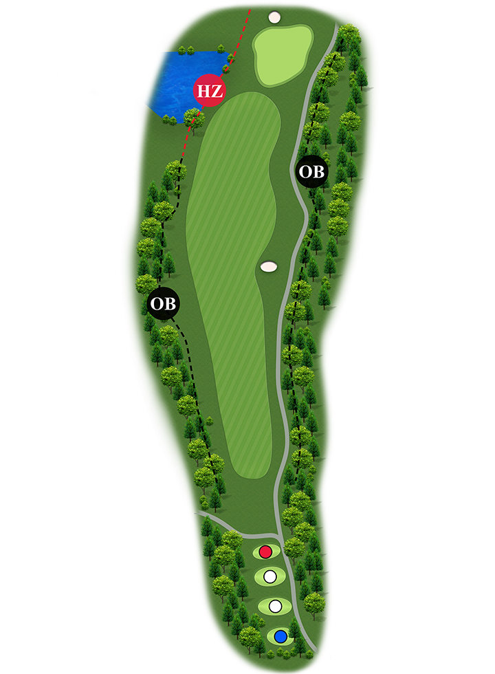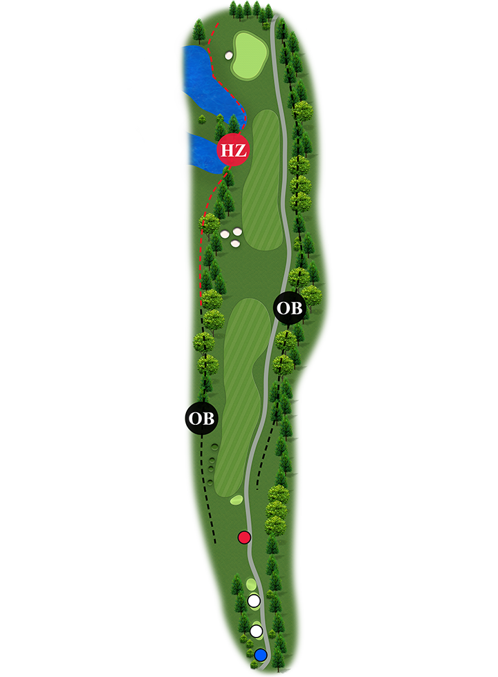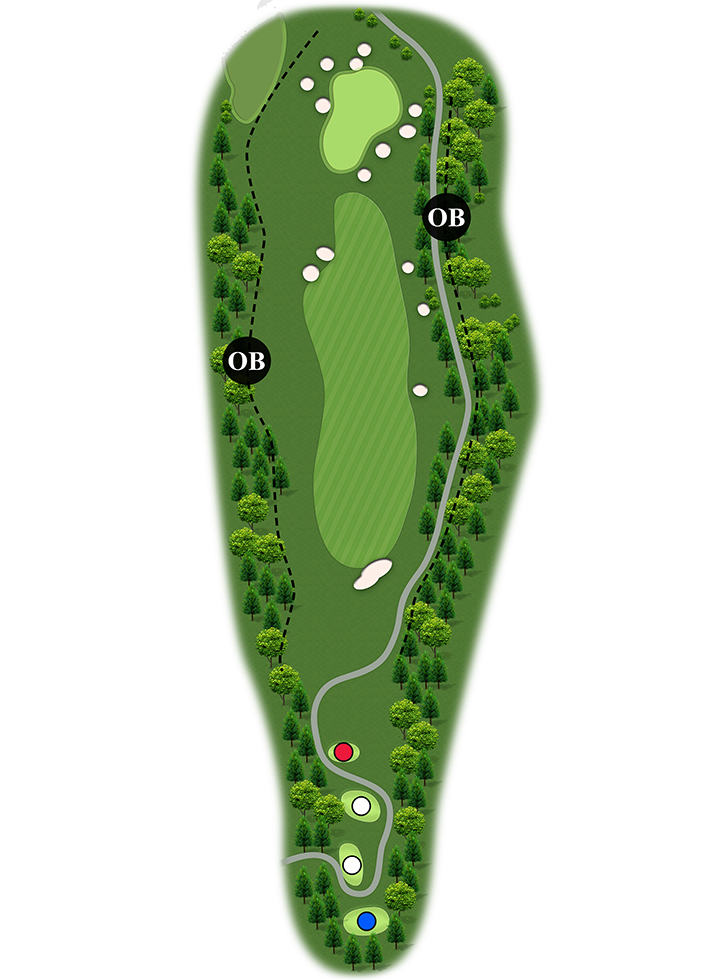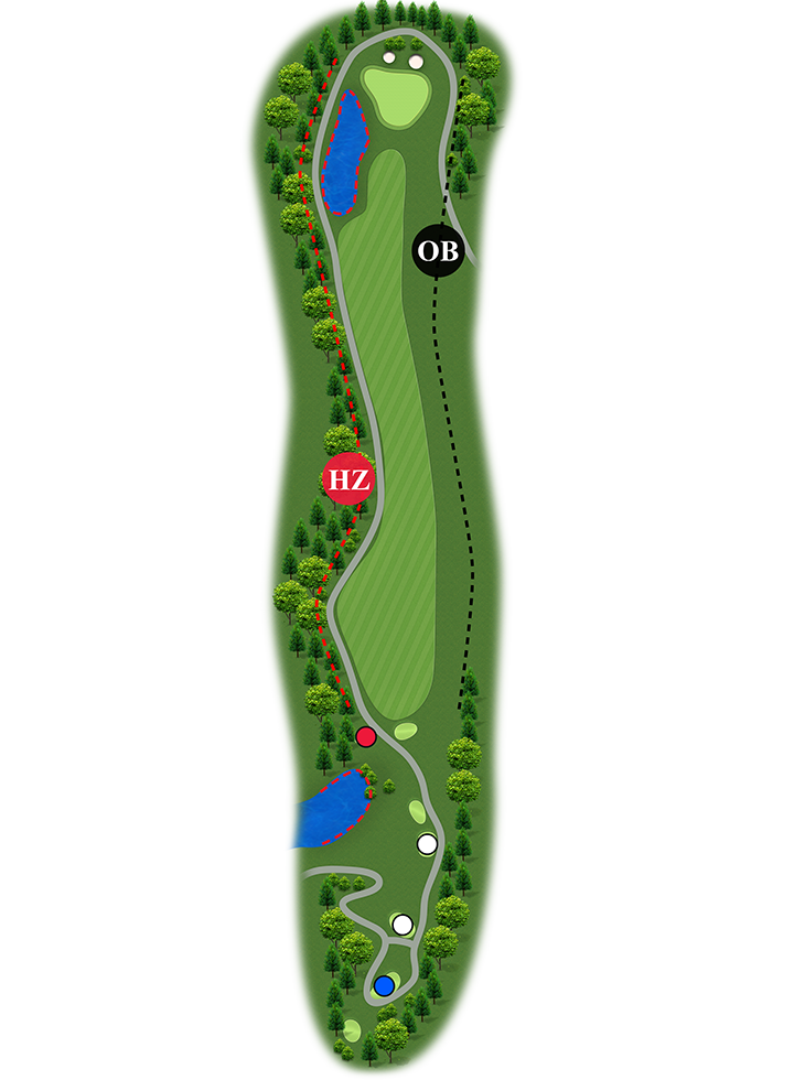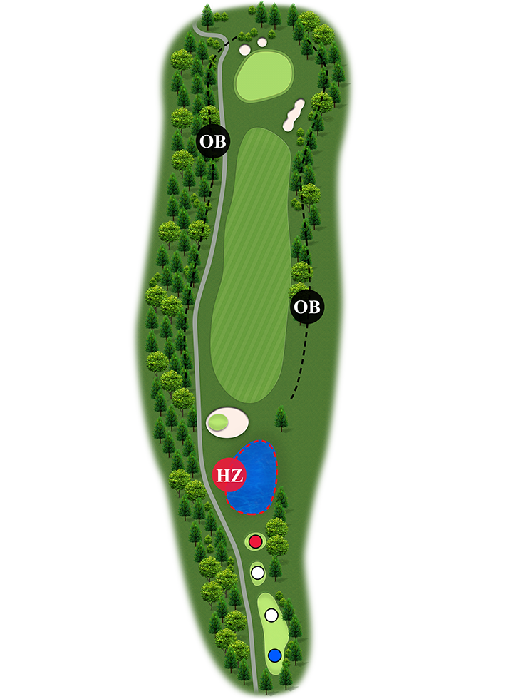 양측 OB지역이다. 티샷은 장타자일 경우 왼쪽 카트도로 쪽으로 공략한다면 One On이 가능한 홀이다. 하지만 방향성이 정확하지 않다면 해저드에 들어 갈 수 있다. 세컨샷은 긴것 보다는 짧은것이 유리하다.