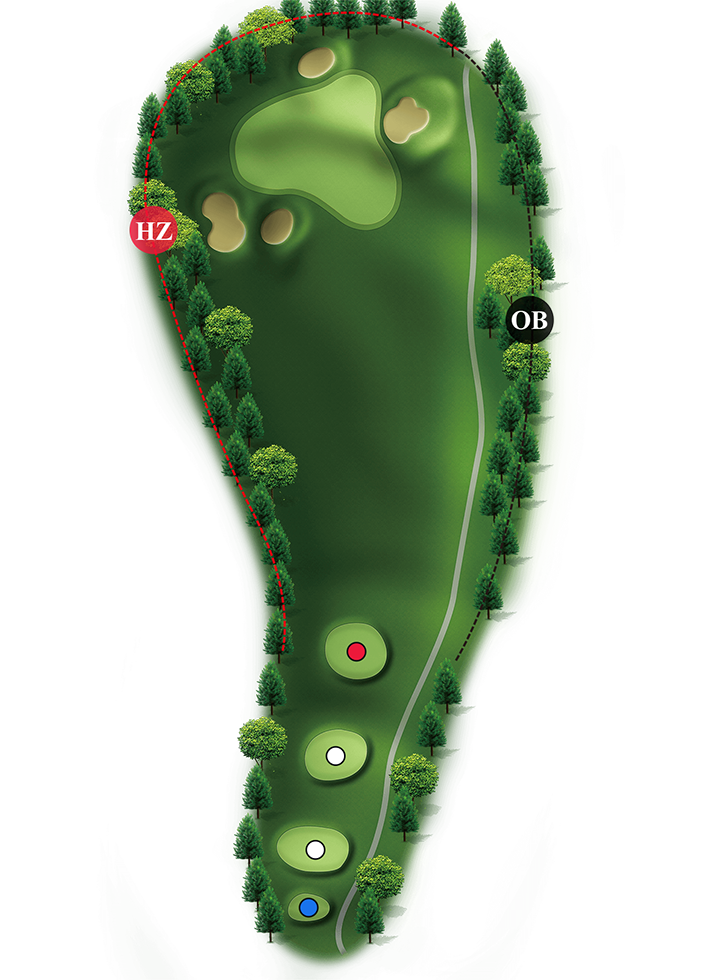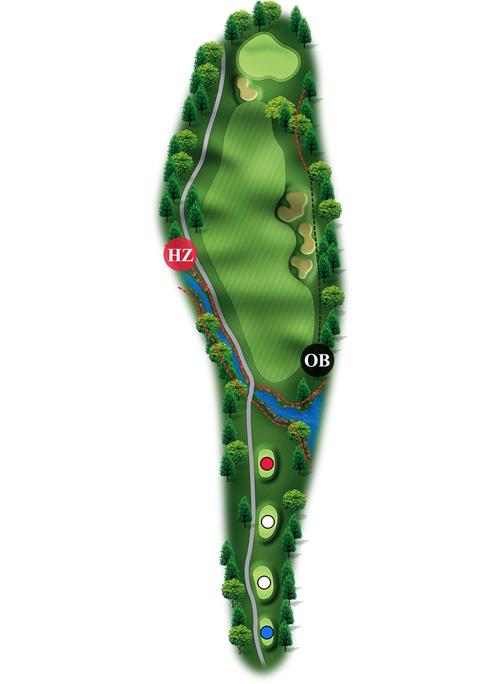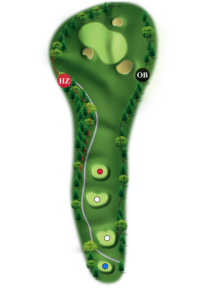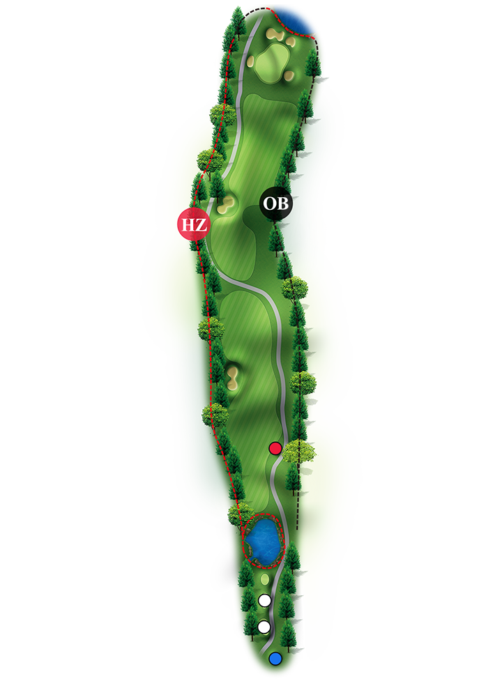 패널티구역을 넘기는 티샷을 하는 파4홀로 심리적 부담을 이겨내는 것이 중요합니다. 이단 그린으로 뒷핀을 사용할 경우 마운드를 넘기는 비거리 계산이 중요합니다.
