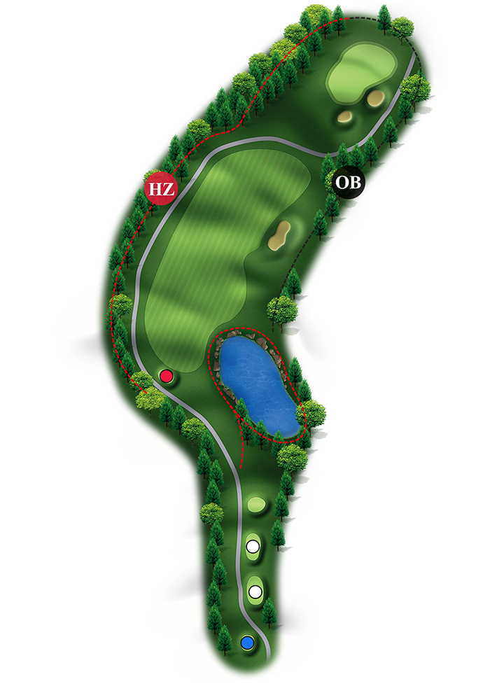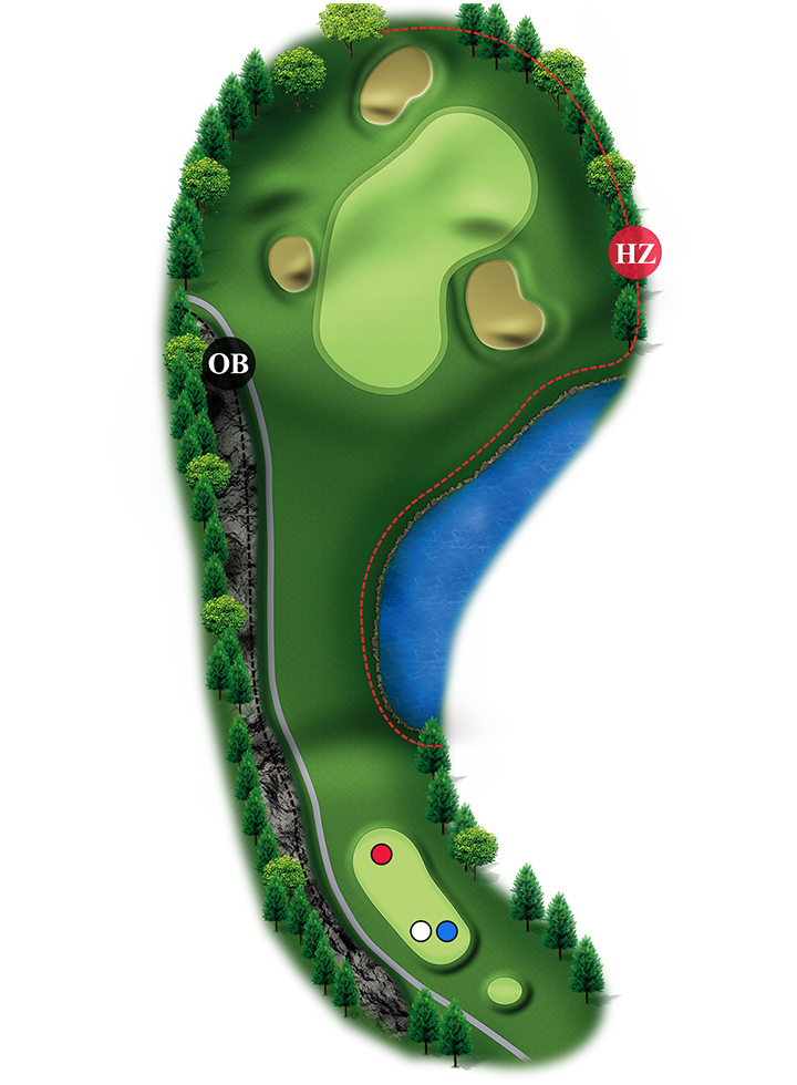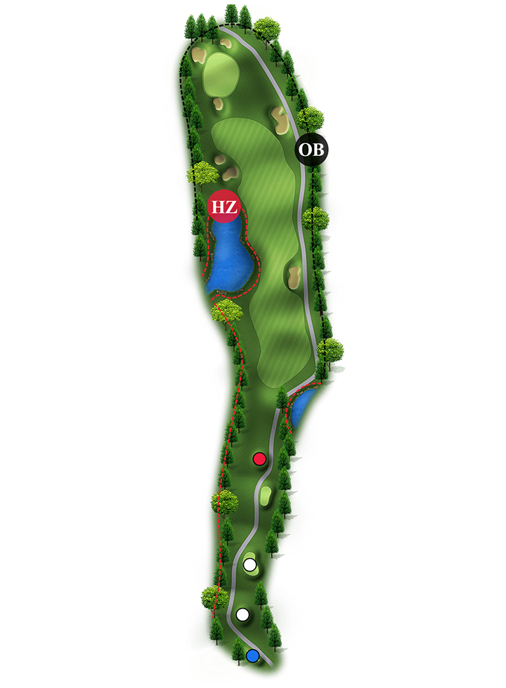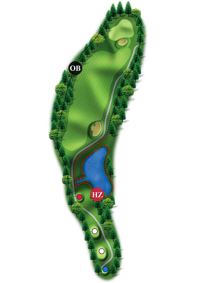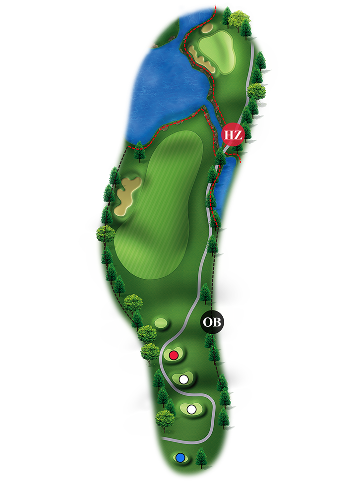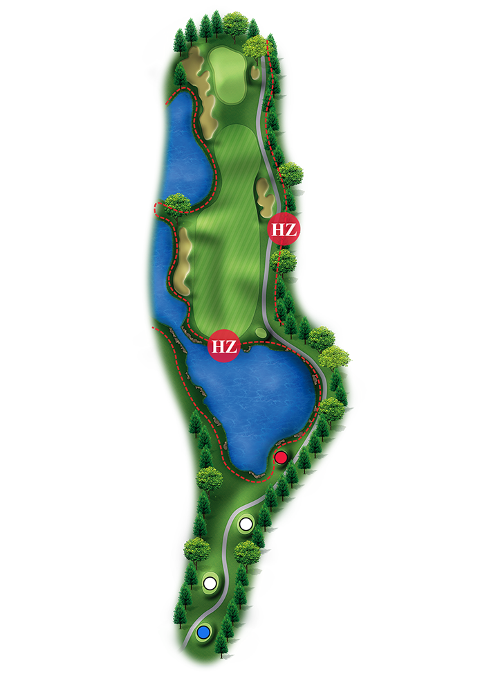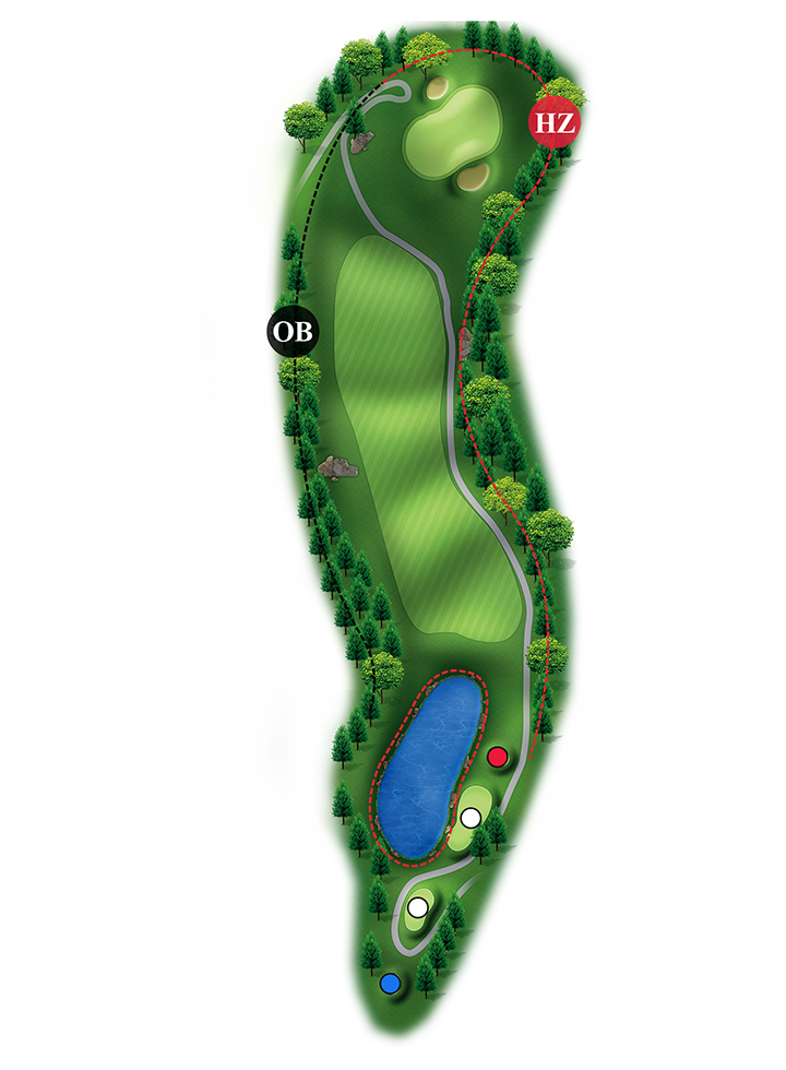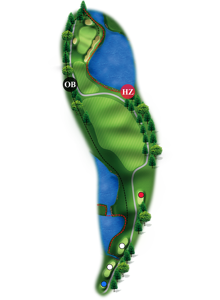 내리막 파4홀로 티샷이 장타가 나올 경우 워터해저드에 빠질 위험이 있으므로 우드나 롱아이언으로 티샷 하는 것이 안전합니다. 그린이 아일랜드 방식으로 핀 방향보다는 그린 중앙으로 공략하는 것이 유리합니다.