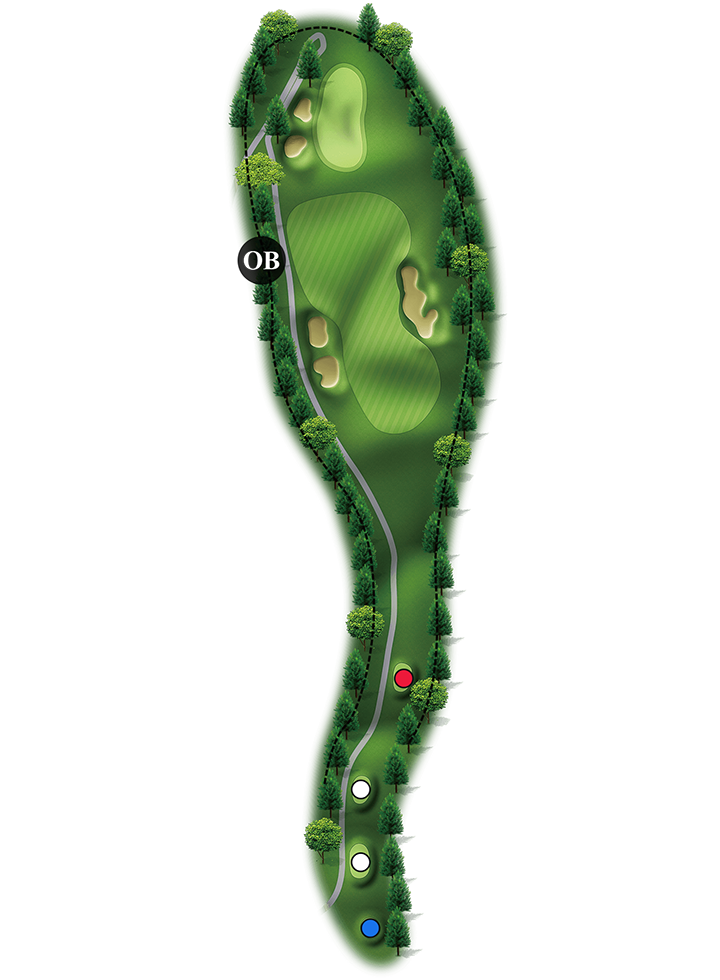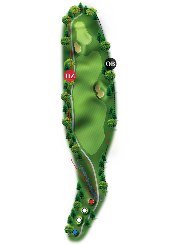비교적 거리가 짧은 파5홀로 장타자라면 충분히 2온이 가능한 홀입니다. 페어웨이가 좁고, 군데군데 벙커와 패널티 구역이 숨어 있어 정확한 방향성이 필요합니다.