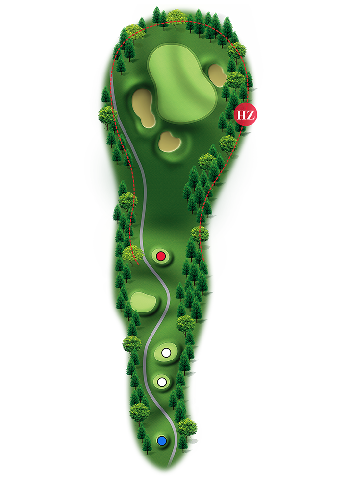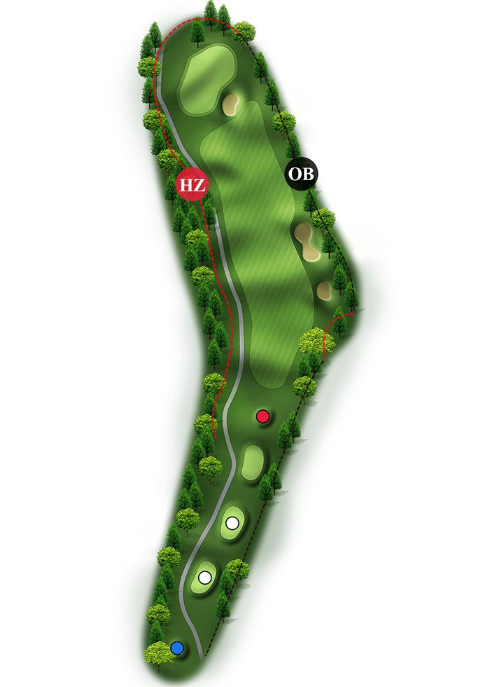 오르막이 있어 그린이 보이지 않는 스트레이트 파5홀로 페어웨이가 좁은 편으로 무리한 투온 공략보다는 안전한 쓰리온 공략이 스코어를 지키는 방법입니다. 그린 앞뒤 벙커를 주의해야 합니다.