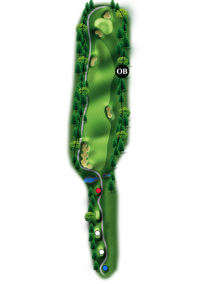 내리막 우측 도그렉 파4홀로 IP지점이 비교적 넓어 부담없는 티샷을 할 수 있는 홀 입니다. 우측으로 슬라이스가 나오지 않게 안전한 IP지점으로 티샷을 하는 것이 스코어를 지킬 수 있습니다.