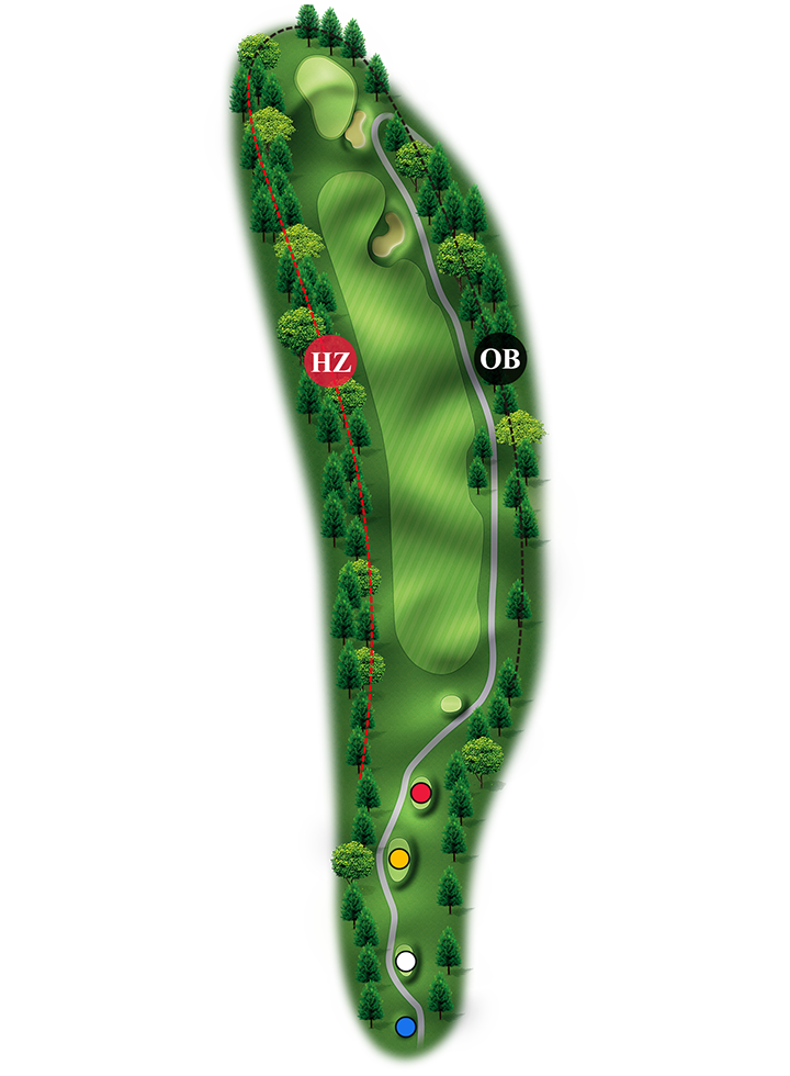 오르막 우측 도그렉 파4홀로 티샷 난이도가 높은 홀입니다. 페어웨이 좌측을 공략하면 그린 시야확보에 유리하므로 드로우 샷이 좋습니다.