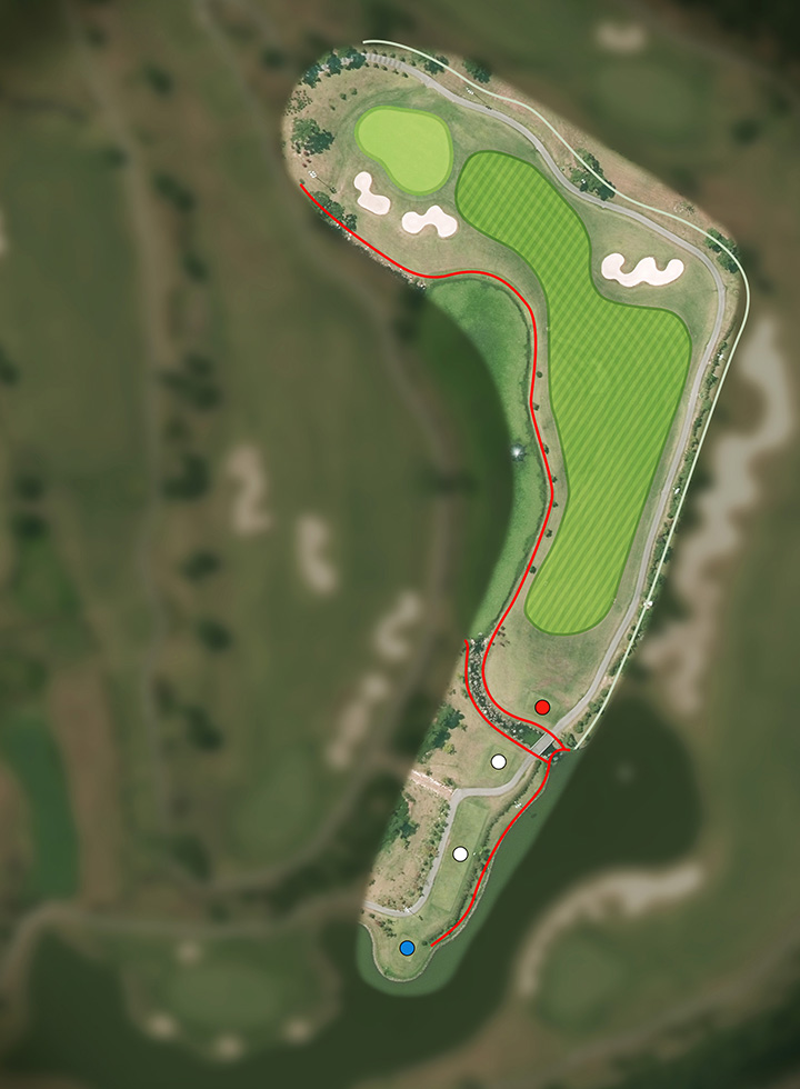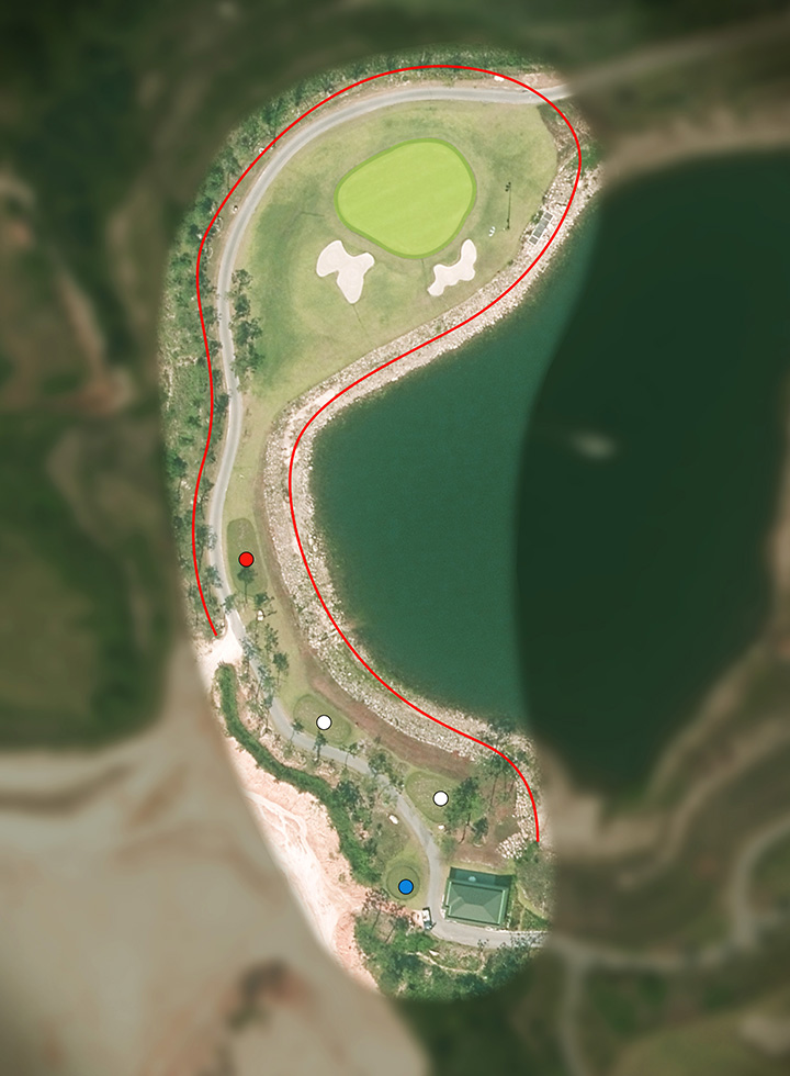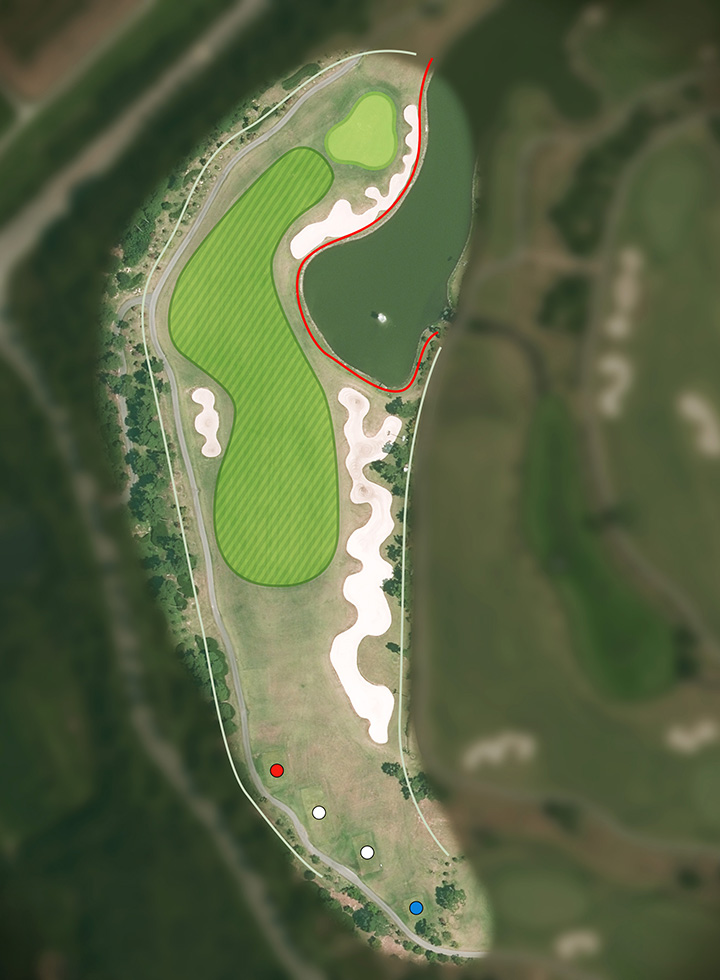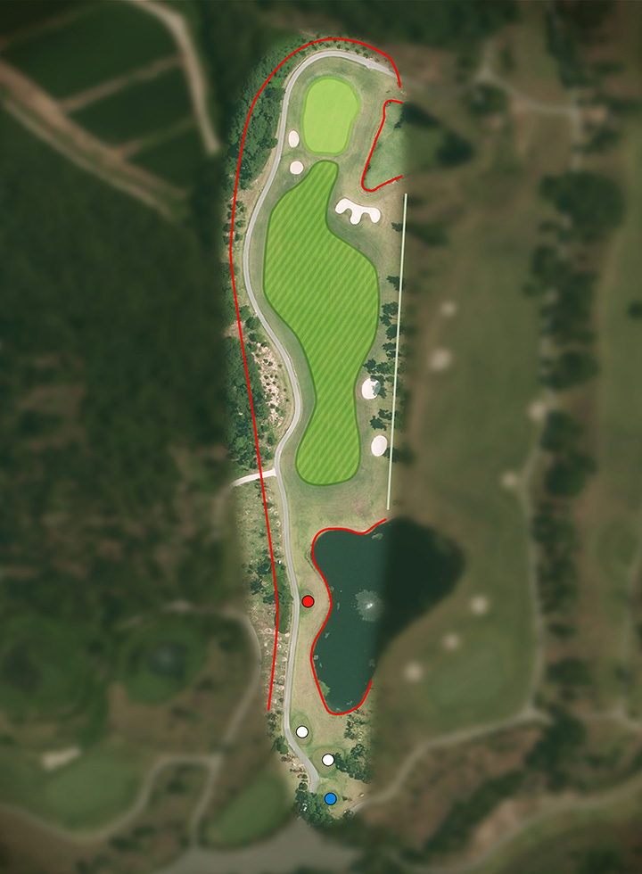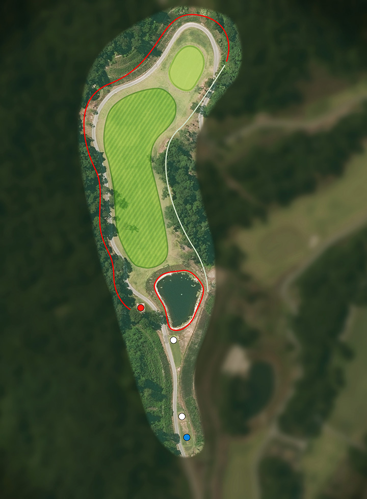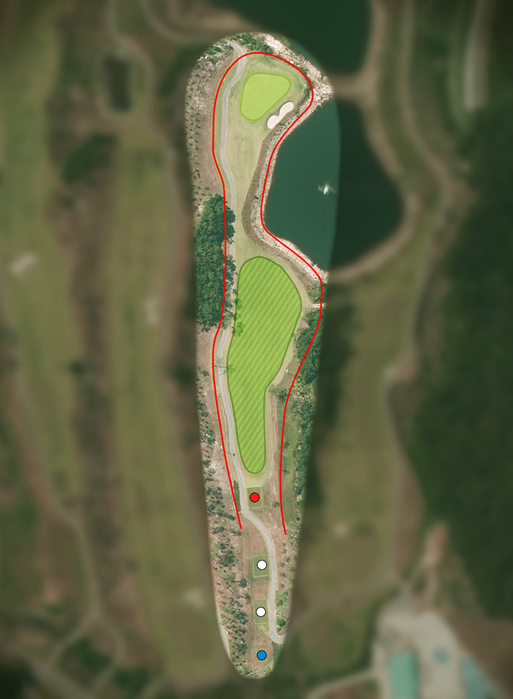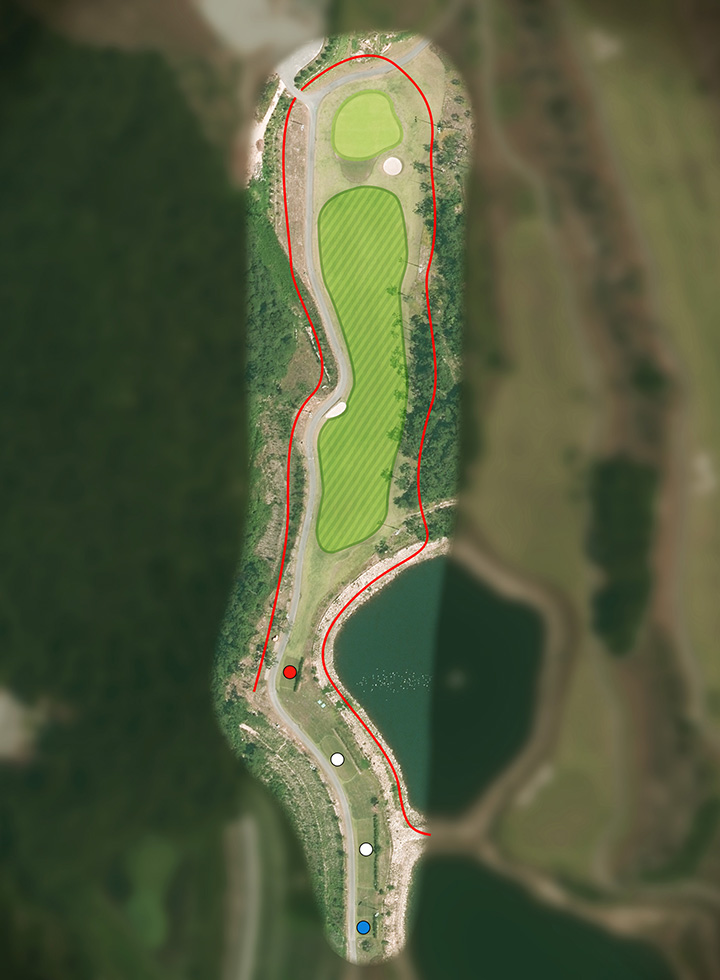 드래곤 코스의 마지막 홀로, 방향은 중앙이 좋습니다.우측으로 형성된 해저드를 유의하시고, 그린 중앙에 좌측으로 공략하는게 좋습니다.</br>
