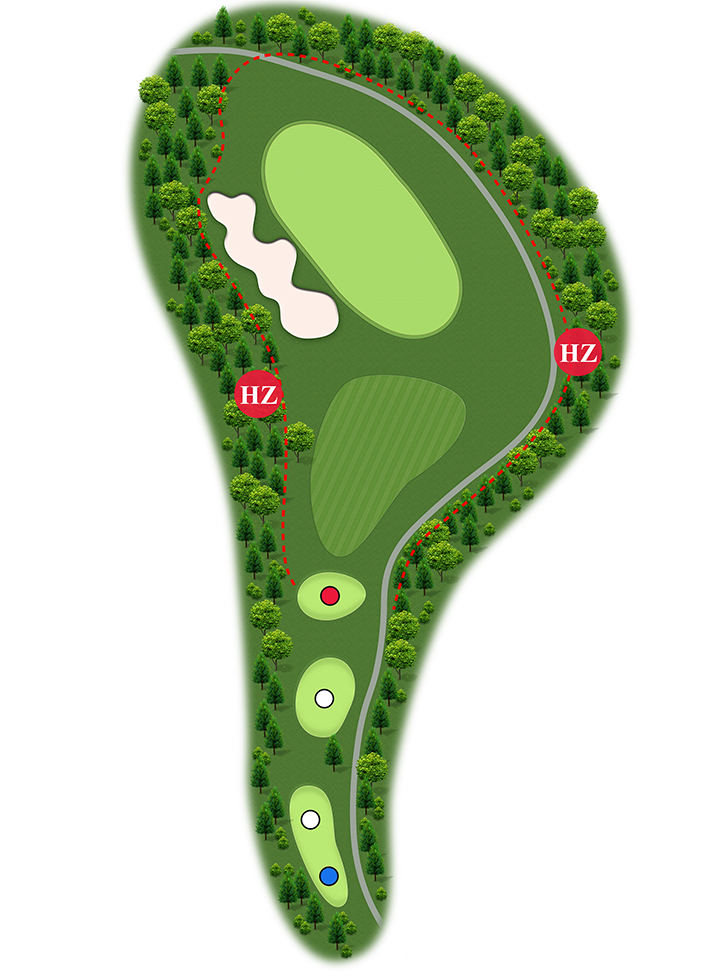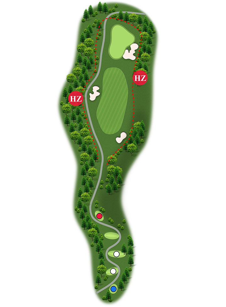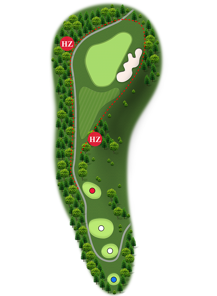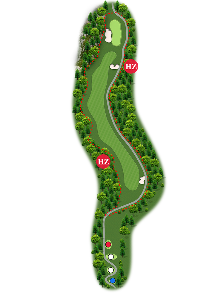 • 내리막 홀로써 고저 차가 심해 내리막 거리를 감안한 샷을 구사해야 한다. 그린 중앙을 보고 공략하면 무난한 홀이다.