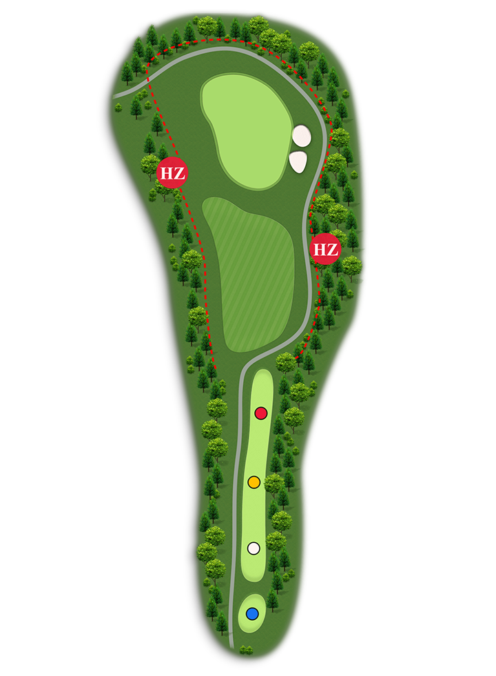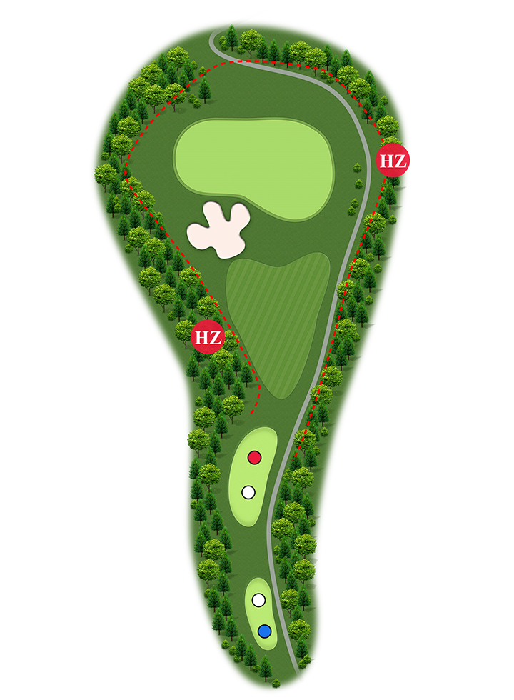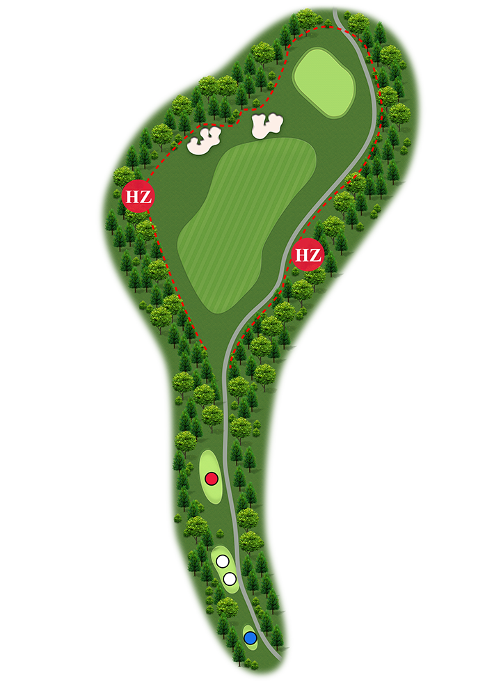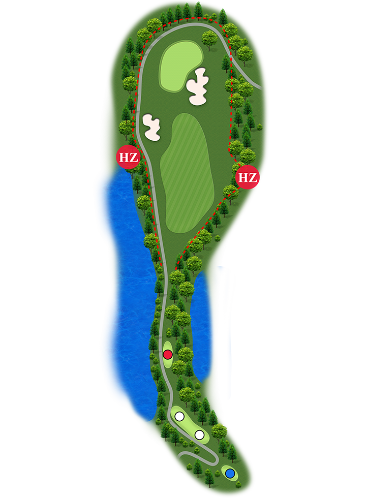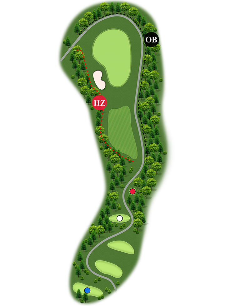 • 내리막 홀로써 고저 차가 심해 내리막 거리를 감안한 샷을 구사해야 한다. 그린 중앙을 보고 공략하면 무난한 홀이다.