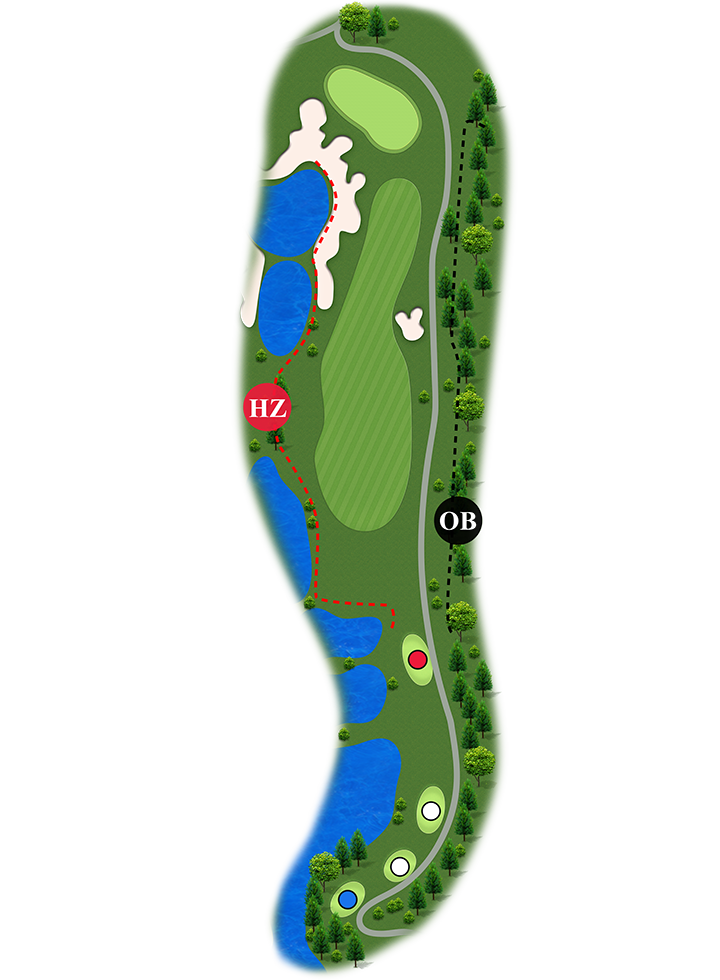 • 티박스에서 그린까지 시야가 탁트인 평이한 홀이다. 왼쪽은 해저드, 오른쪽은 OB 지역으로 페어웨이 왼쪽 공간을 공략하면 된다.