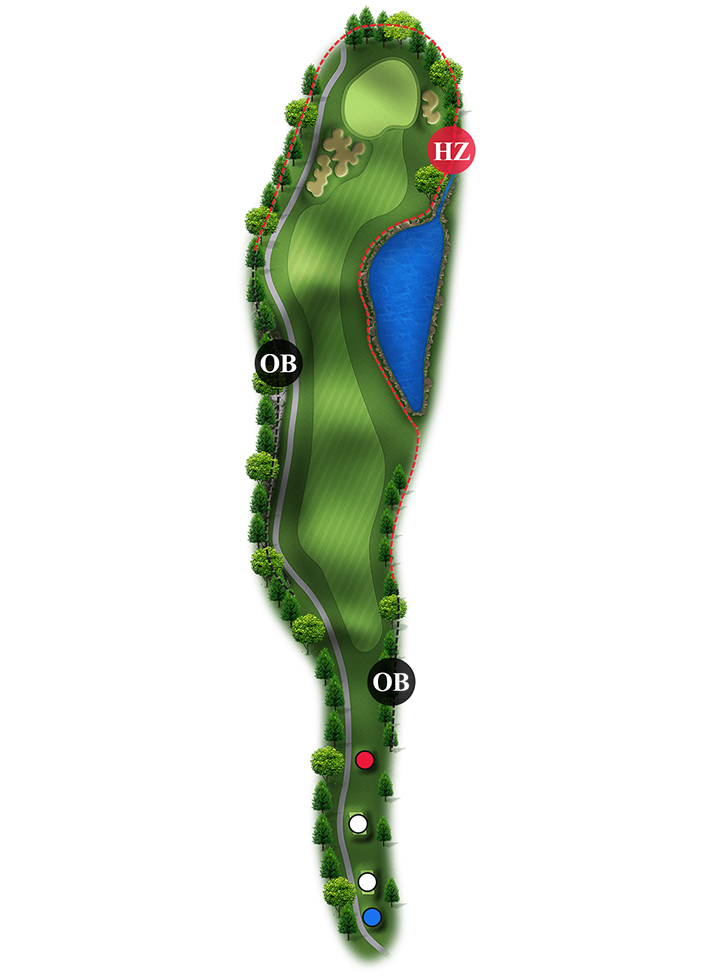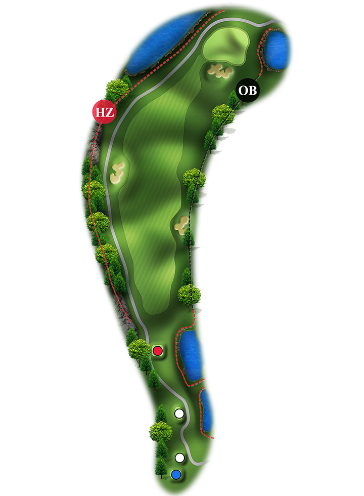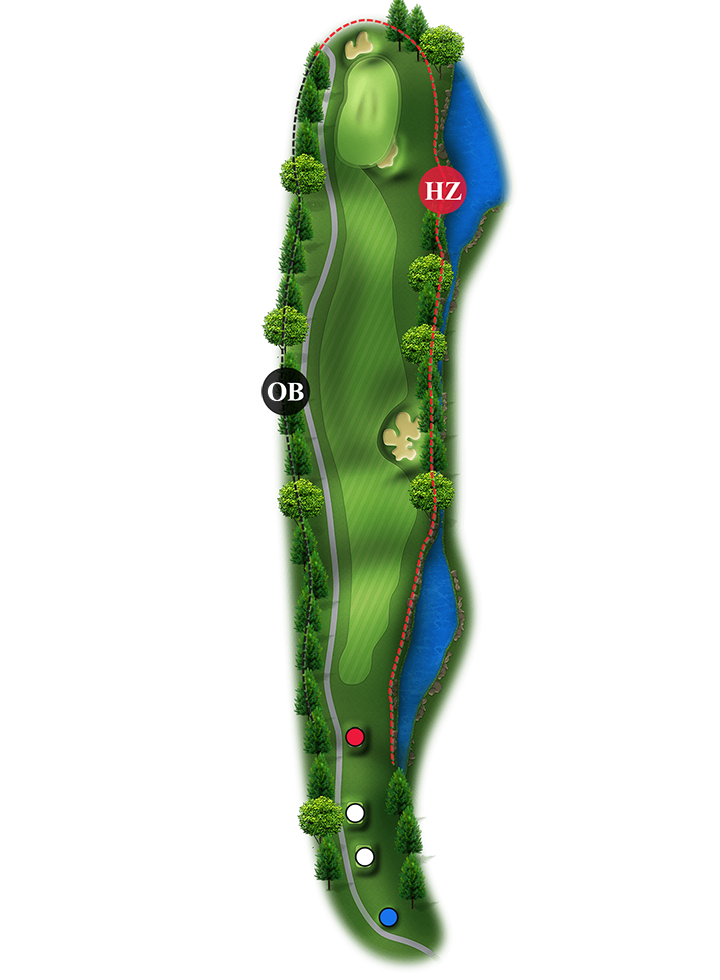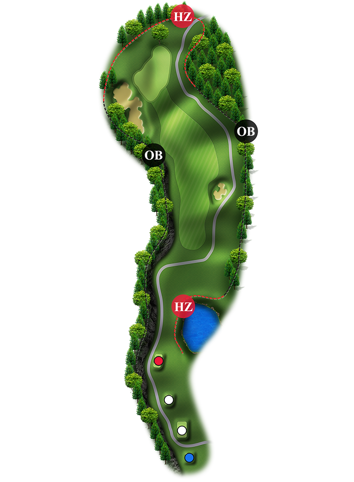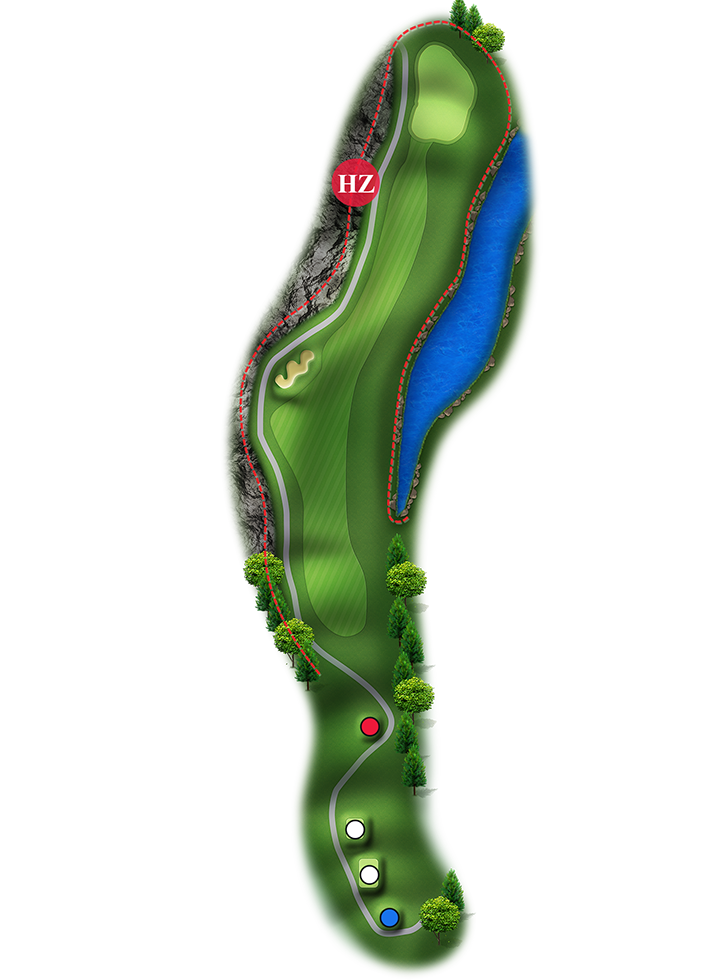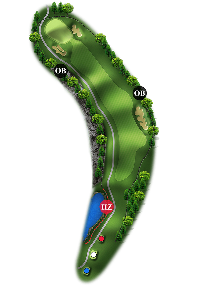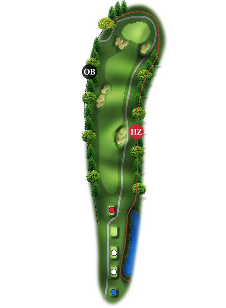 페어웨이 우측 해저드 및 페어웨이 벙커가 위협적인 par4 홀! 여느 홀 보다 정확한 티샷이 요구되며 세컨샷 또한 그린 뒤쪽으로 흐르는 경사로 인해 짧게 공략하는 것이 좋다.