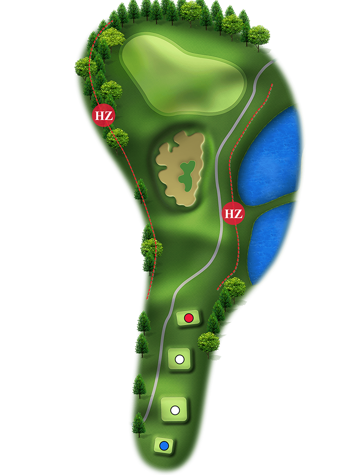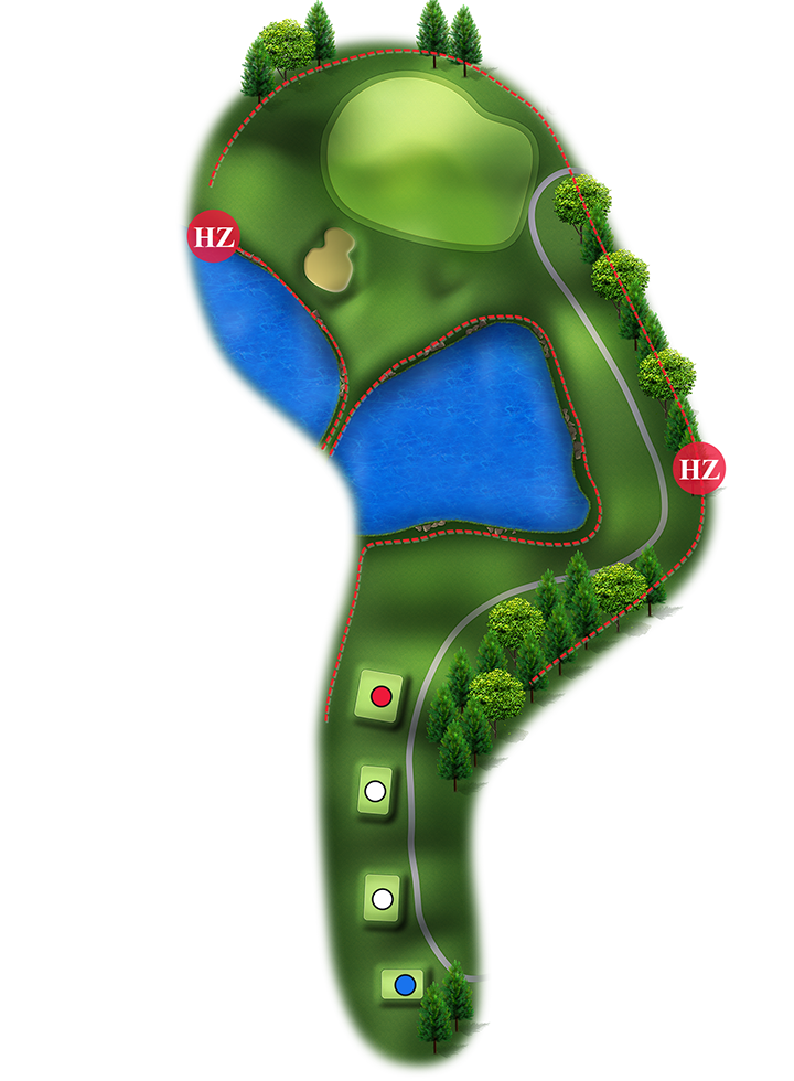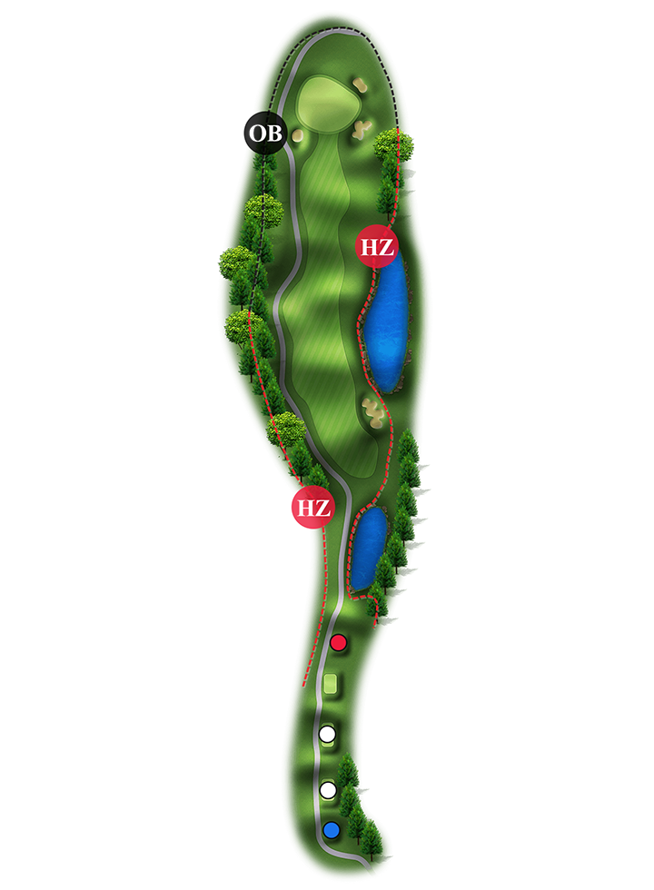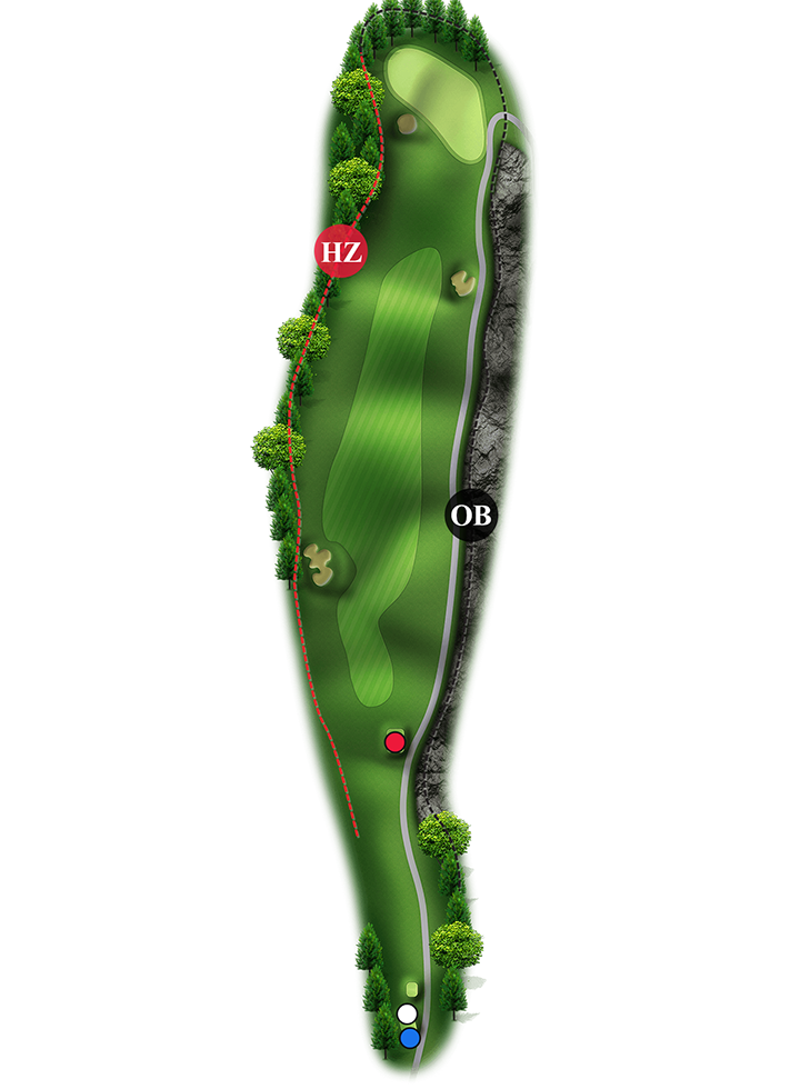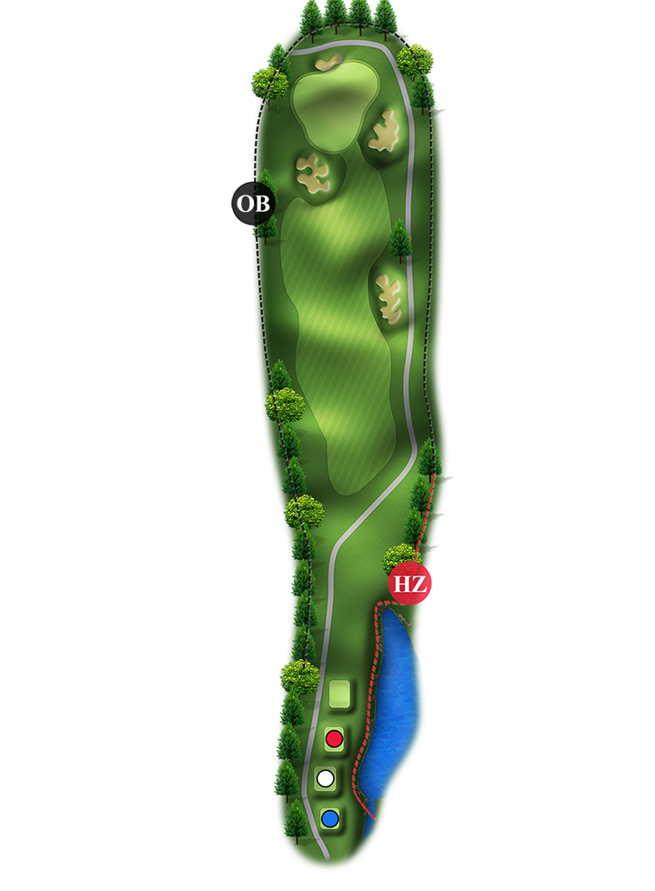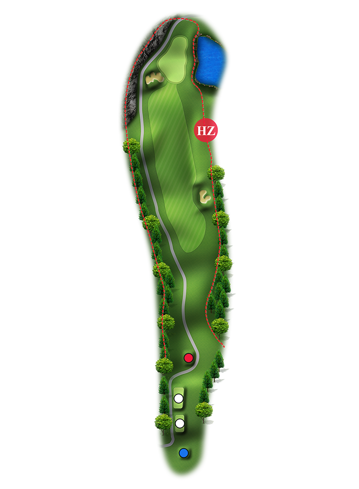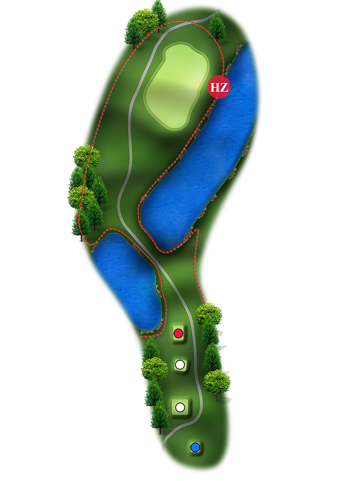 페어웨이 우측 해저드 및 페어웨이 벙커가 위협적인 par4 홀! 여느 홀 보다 정확한 티샷이 요구되며 세컨샷 또한 그린 뒤쪽으로 흐르는 경사로 인해 짧게 공략하는 것이 좋다.