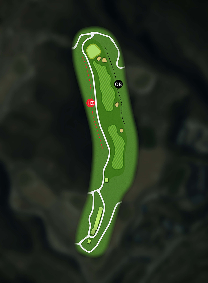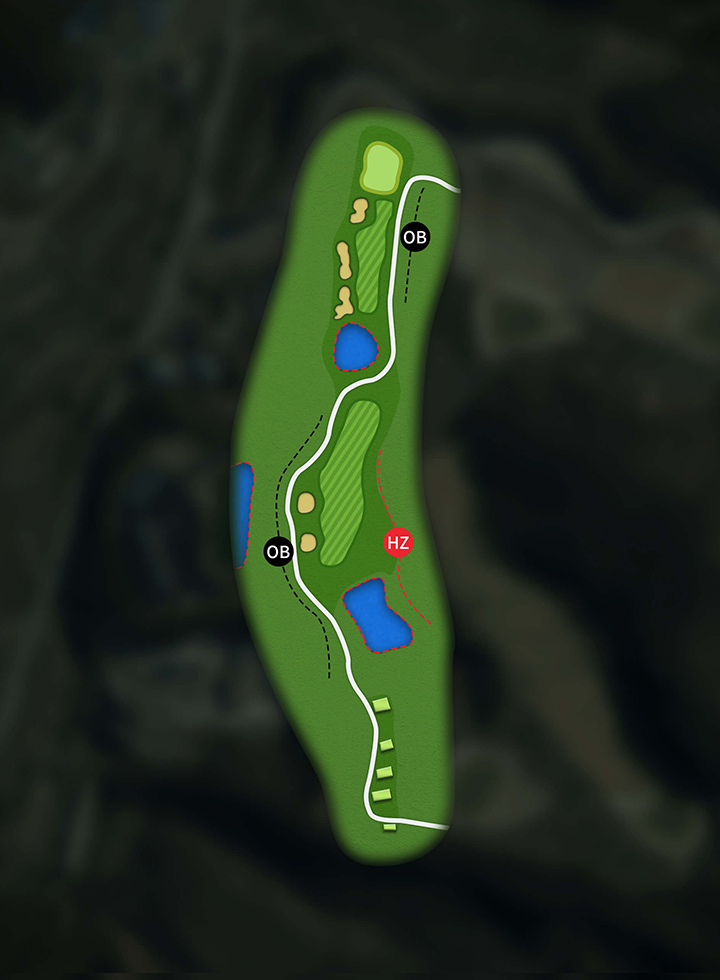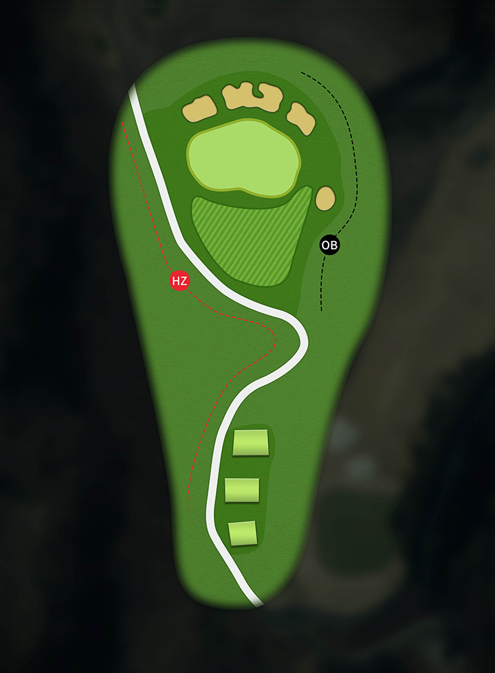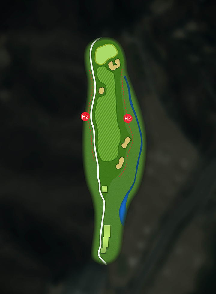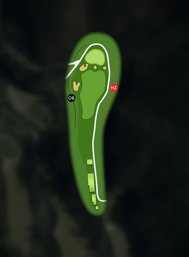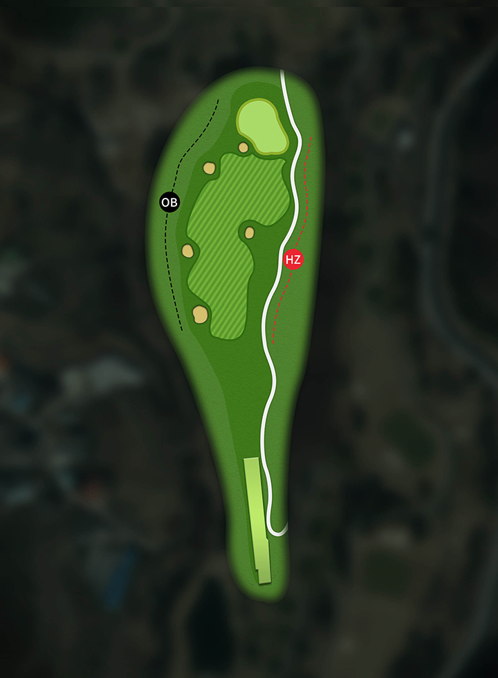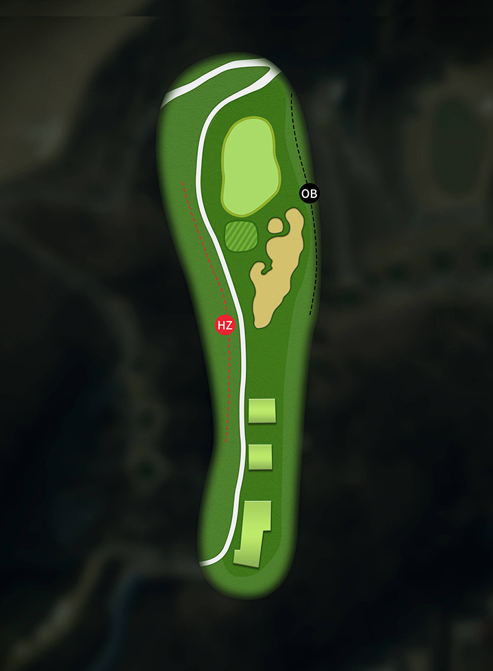 좌측으로 커다란 해저드가 있는 짧은 내리막 파4홀로 티샷 낙하 지점부터 그린까지 가파른 오르막 지형입니다. 티샷은 우측 두번째 벙커 약간 좌측 방향이 이상적입니다.