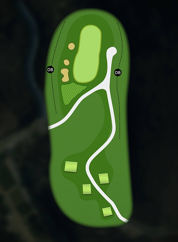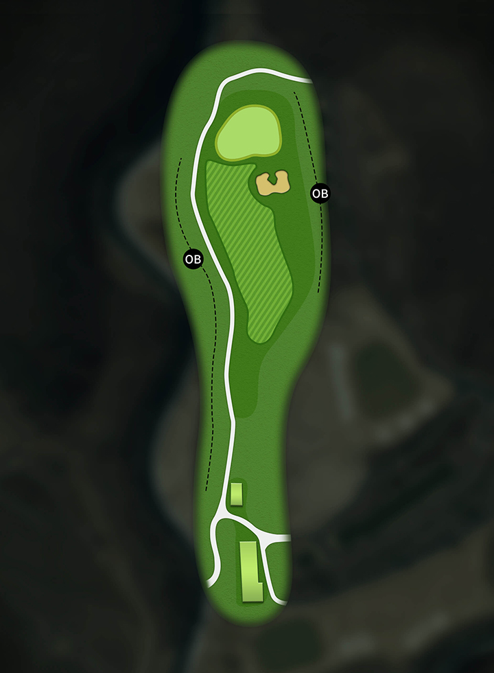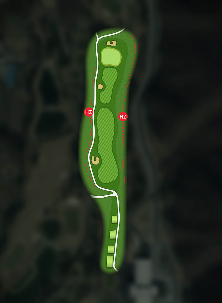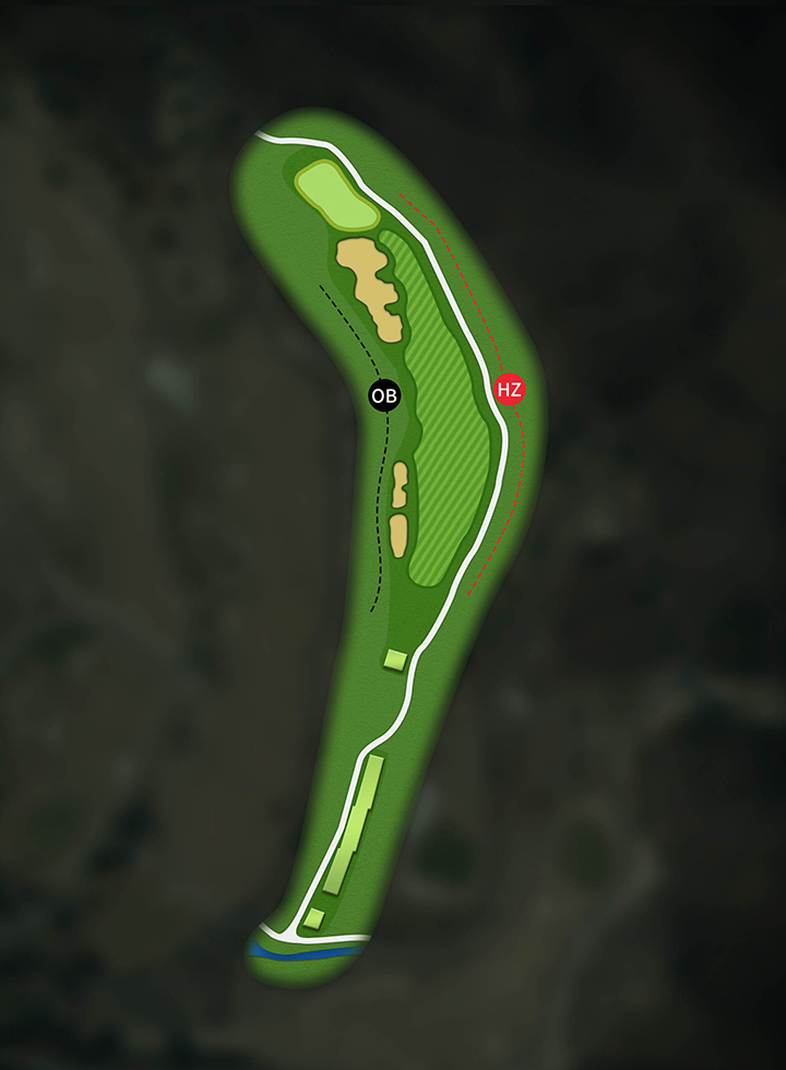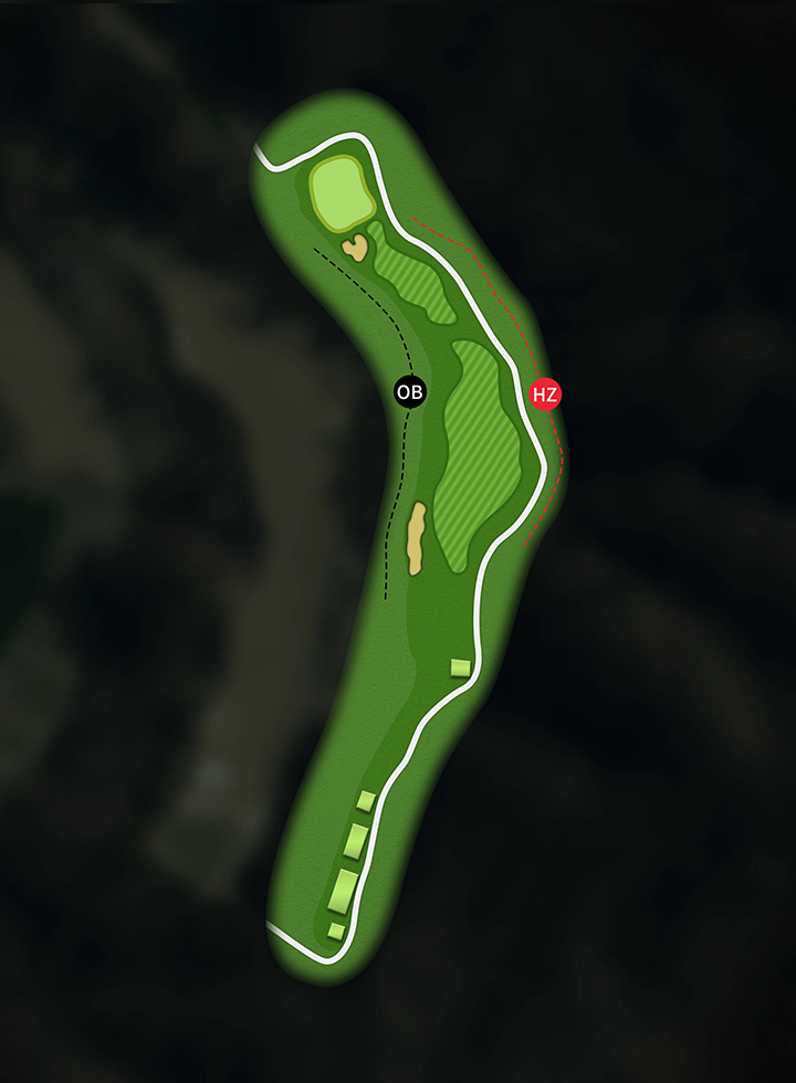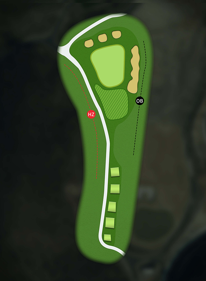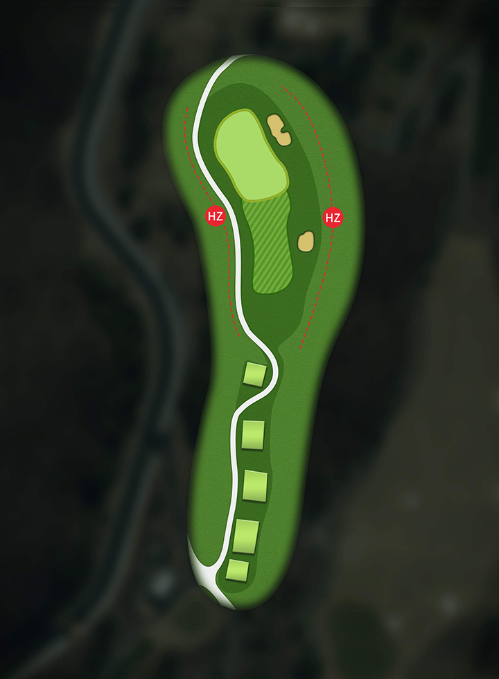 좌측으로 커다란 해저드가 있는 짧은 내리막 파4홀로 티샷 낙하 지점부터 그린까지 가파른 오르막 지형입니다. 티샷은 우측 두번째 벙커 약간 좌측 방향이 이상적입니다.