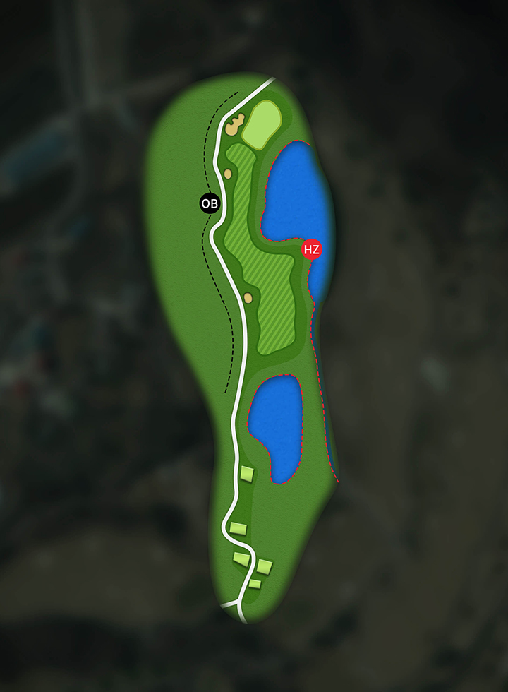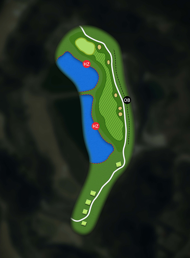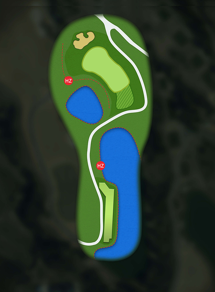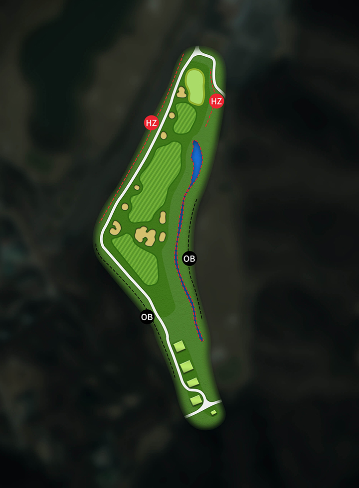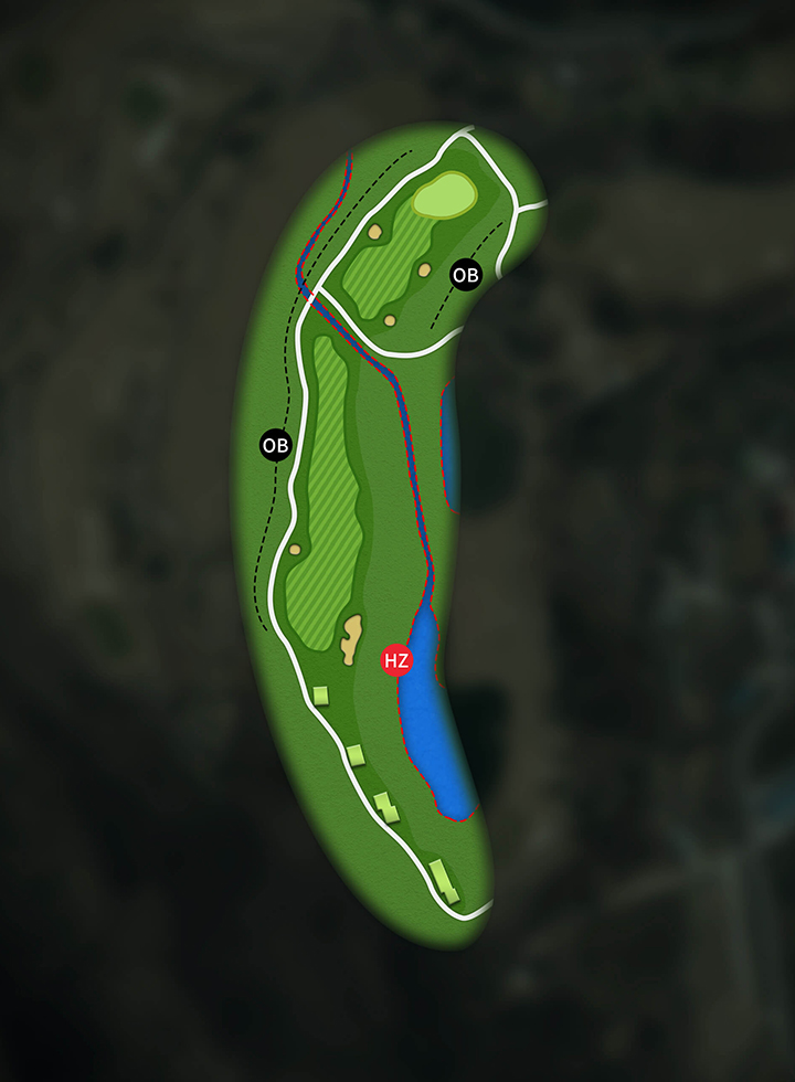 좌측으로 그린까지 커다란 폰드가 있어 시각적으로 부담감을 크게 느끼는 가파른 내리막 좌도그랙 파4홀입니다. 티샷은 3번째 벙커 방향으로 보내야 안전한 최단거리입니다. 대각선 그린으로 해저드를 넘기는 과감한 샷으로 핀보다 오른쪽으로 공략하는 것이 안전합니다.