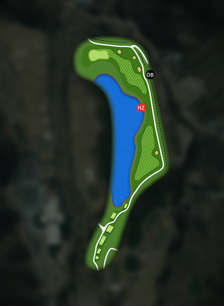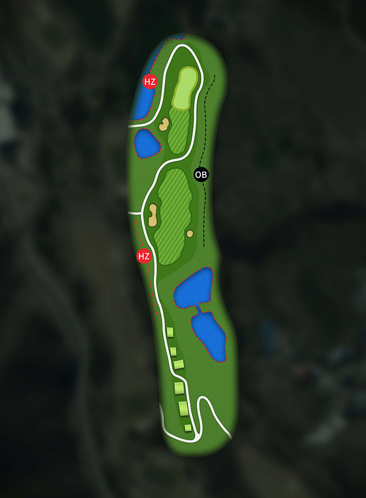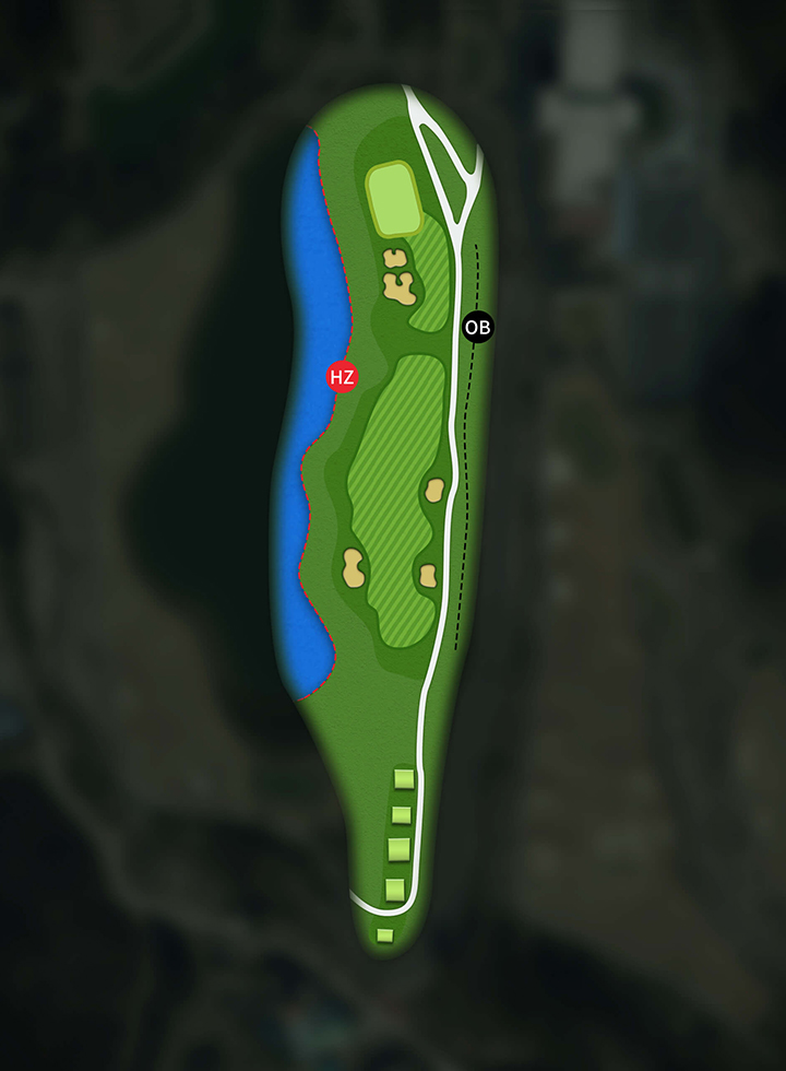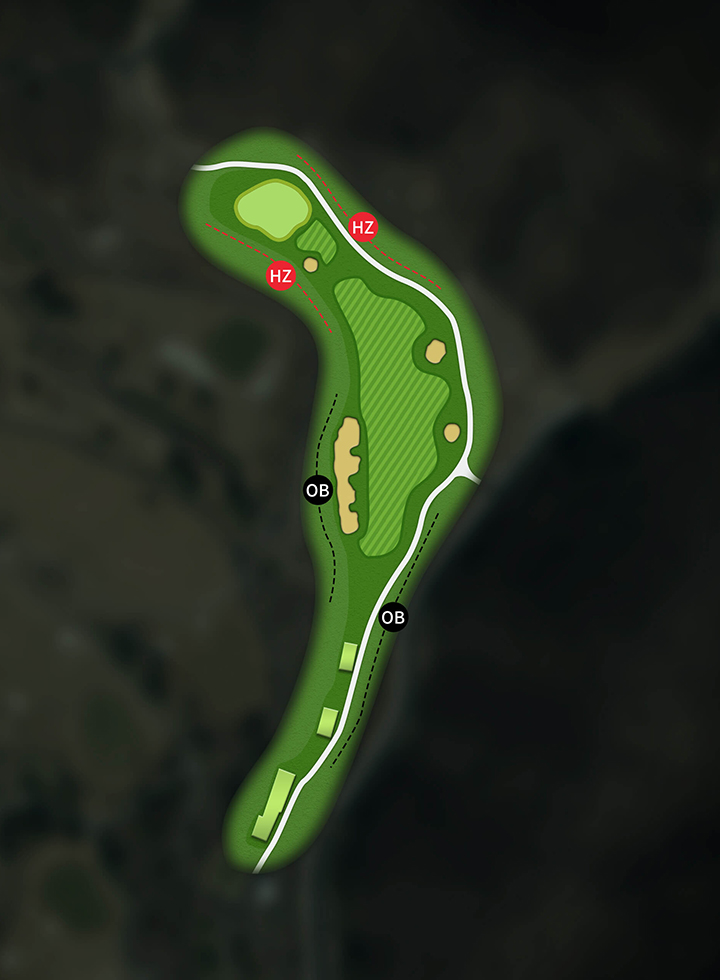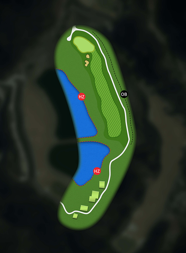 좌측으로 그린까지 커다란 폰드가 있어 시각적으로 부담감을 크게 느끼는 가파른 내리막 좌도그랙 파4홀입니다. 티샷은 3번째 벙커 방향으로 보내야 안전한 최단거리입니다. 대각선 그린으로 해저드를 넘기는 과감한 샷으로 핀보다 오른쪽으로 공략하는 것이 안전합니다.