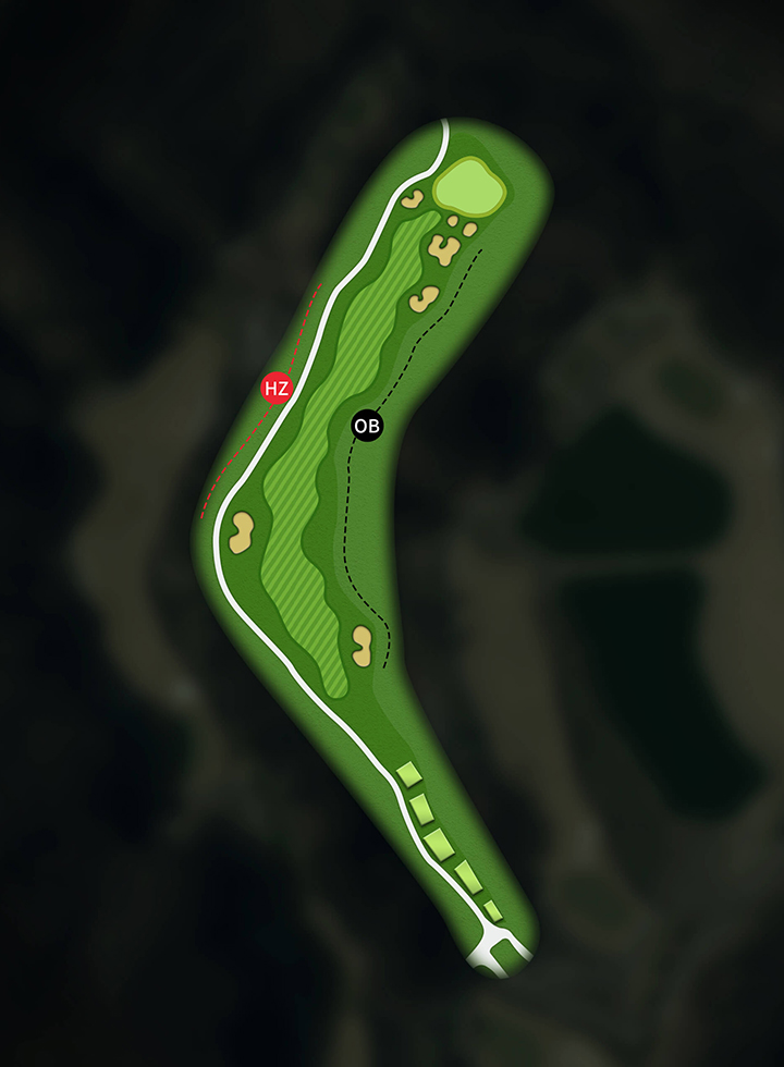 우측으로 길게 폰드가 이어지고 곳곳에 수많은 벙커들이 산재한 짧은 거리 우도그랙 파5홀입니다. 티샷으로 전면에 보이는 벙커만 넘기면 충분히 투온도 가능하지만 페어웨이 굴곡이 심해 신중하고 견고하게 스텐스를 잡아야 성공적인 샷을 구사 할 수 있습니다.