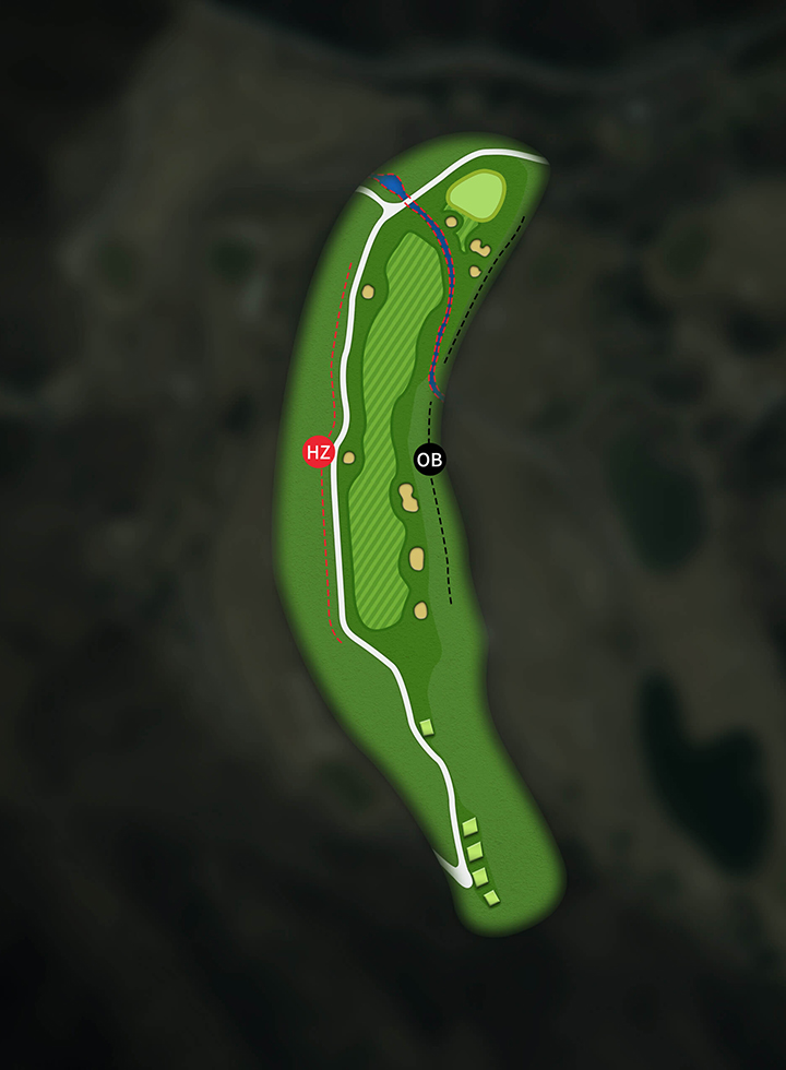 그린까지 계속 오르막 경사로 이어진 좌도그랙 파 4홀입니다. 티샷은 페어웨이 우측 2번째 벙커 방향으로 보내면 중앙에 안착될 것입니다. 세컨 지점 부터 그린까지 가파른 오르막으로 한두 클럽 길게 잡아야 하며 그린 좌측 경계 표시 나무보다 무조건 우측으로 보내야합니다.