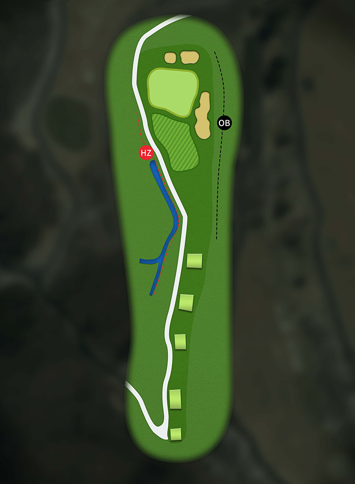완만한 내리막 우도그랙 파5홀로 그린 앞자락으로 가로지른 계 류지가 흐른다. 티샷은 멀리 좌 벙커 약간 우측으로 보내면 내리막 경사를 타고 의외로 멀리 보낼 수 있다. 장타자는 투온도 바라볼 수 있으나 그린 앞 계류지를 넘기는 모험과 안전한 레이업 등 선택사양이다.